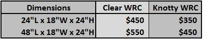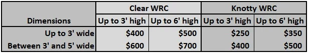All of our outdoor products can be built with either clear or knotty grade Western Red Cedar (WRC). Other than the difference in price, clear cedar contains no knots and offers a clean contemporary look, while knotty cedar has a rustic feel with several tight knots at a lesser cost. The following price tables show the standard costs of our most popular products in both clear and knotty grade cedar.